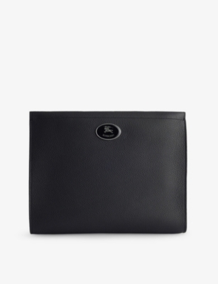 Burberry leather pouch100% calf leatherZip fasteningRectangle shape, enamelled Equestrian Knight Design plaque at front, one main compartment, six interior card slots, one interior slip pocket, hand-painted edges, Burberry Check lining, grained finishHeight 21.5cm, width 27cm, depth 7.5cmSpecialist leather cleanComes with a dust bag