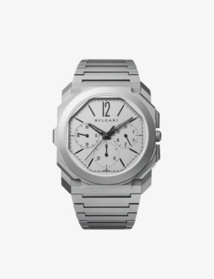 Bvlgari titanium automatic watch100% titaniumStyle number: 103068Folding-clasp fasteningOctogonal dial, extra-thin mechanical manufacture movement with automatic winding and date, BVL 318 calibre, 55hr power reserve, transparent case back, braceletCase diameter: 42mmWipe with a clean, dry clothWater resistance: 3 bar / 3 atm / 30m / 100ftMade in SwitzerlandThree-year manufacturer’s warrantyBvlgari prides itself on providing excellent customer service. This includes contacting customers to offer after-sales care and share details about its brand and products. As such, when you order a Bvlgari product from us, your details will be passed onto Bvlgari so that it can provide these services to youTo learn more about this product or for expert styling services, get in touch with our Personal Shopping team