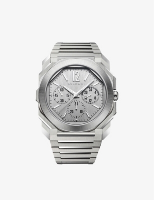 .Bvlgari stainless-steel quartz watch100% stainless-steelStyle number: 103661Clasp fasteningOctagonal design, automatic winding, hours (peripheral rotor), minutes, small seconds, second time zone, ultra-thin movement, rhodium-plated indexes with SLN, transparent case back, polish braceletCase diameter: 4.3cmPlease refer to the brand’s care instructionsWater resistance: More than 30 bar / 30 atm / 300m / 990ftMade in SwitzerlandTwo-year manufacturer’s warrantyBulgari prides itself on providing excellent customer service. This includes contacting customers to offer after-sales care and share details about its brand and products. As such, when you order a Bulgari product from us, your details will be passed onto Bulgari so that it can provide these services to youTo learn more about this product or for expert styling services, get in touch with our Personal Shopping team
