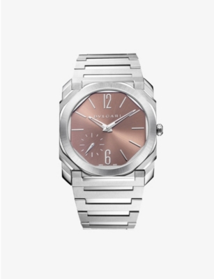 Inspired by The Basilica of Maxentiu, Bvlgari’s Octo Finissimo watch is a magnificent celebration of ancient Roman architecture. It’s constructed from exceptionally robust and durable stainless steel, then defined by a slender, octagonal case and a sun-brushed metallic dial with rhodium-applied stickers – not to mention its precise, Swiss-made automatic movement. The dial is decorated with cĆ“tes de GenĆØve and chamfering to sign things off.Bvlgari stainless-steel automatic watch100% stainless steelStyle number: RE00033Folding-buckle fasteningOctagonal sun-brushed metallic dial with rhodium applied stickers, satin-polished case, self-winding manufacture movement, automatic winding (platinum micro-rotor), BVL 138 calibre, hours, minutes and small seconds, 60-hour power reserve, frequency 21’600 Vph (3Hz), 31 jewels, polished stainless-steel screw-down crown set with a ceramic insert, synthetic-sapphire glass, transparent case back, integrated braceletCase diameter: 40mmWipe with a clean, dry clothWater resistance: 10 bar / 10 atm / 100m / 330ftMade in SwitzerlandTwo-year manufacturer’s warrantyBvlgari prides itself on providing excellent customer service. This includes contacting customers to offer after-sales care and share details about its brand and products. As such, when you order a Bvlgari product from us, your details will be passed onto Bvlgari so that it can provide these services to you.To learn more about this product or for expert styling services, get in touch with our Personal Shopping team