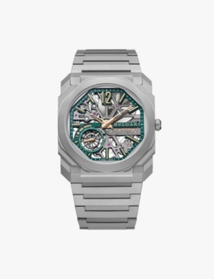 Bvlgari titanium manual watch100% titaniumStyle number: RE00103Three-blade folding buckleSpecial edition exclusive to United Kingdom, ultra-thin design, skeletonised octogonal dial, manual winding, 8 days power reserve, openwork dial, synthetic sapphire glass, calibre: BVL 199, skeletonized bridges, small seconds, titanium crown set with black ceramic insert, openwork dial with power reserve indicator and small second counter, BVLGARI eight days logo, transparent case back, titanium braceletCase diameter: 40mmWipe with a clean, dry clothWater resistance: 3 bar / 3 atm / 30m / 100ftTwo-year manufacturer’s warrantyBvlgari prides itself on providing excellent customer service. This includes contacting customers to offer after-sales care and share details about its brand and products. As such, when you order a Bvlgari product from us, your details will be passed onto Bvlgari so that it can provide these services to you.