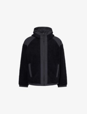 Canada Goose fleece jacket56% wool, 35% polyester, 5% polyamide, 4% other fibersExposed zip fastening at frontRelaxed fit, high-neck, hood, long sleeves, brand patch at sleeve, two buttoned pockets at front, contrast panels, all-over fleece texture, reversibleDry cleanSize medium: length 27in / 69cm, chest 48in / 122cmModel is 6ft 2in/1.88m and wears a size mediumMidweight, stretchy