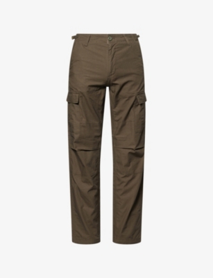 Carhartt WIP cotton-poplin trousers100% cotton; pocketlining 50% polyester, 50% cottonExposed button and concealed zip-fly fastening at frontSlim fit, low-rise, straight-leg, belt loops, buckles at waistband, two slip pockets at front, buttoned pocket at sides and back, brand patch at back, pleated knees, all-over waffle pattern, drawstring cuffsMachine wash at 40°CSize UK 30: rise 11in / 28cm, inside leg 31in / 80cm, leg opening 14in / 36cmModel is 6ft 2in/1.88m and wears a size UK 30Lightweight, slight stretch