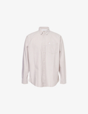 Carhartt WIP cotton shirt100% cottonExposed button fastenings at frontButton-down collarRegular fit, collar, one chest patch pocket, long sleeves, buttoned cuffs, pearlescent buttons, logo embroidered at chest, curved hem, back yoke, side seam gussets, all-over stripe pattern, yarn-dyedMachine wash at 30°CSize medium: length 31in / 79cm, chest 46in / 117cmModel is 6ft 2in/1.88m and wears a size mediumLightweight, non-stretch