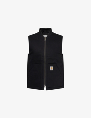 Carhartt WIP cotton vest100% cotton; lining 100% nylon; trims 85% polyester, 15% elastaneExposed zip fastening at frontRegular fit, ribbed band collar, sleeveless, two front slip pockets, logo patch embroidered at front, branded silver-toned hardware, quilted liningMachine wash at 30°CSize medium: length 26in / 66cm, chest 40in / 101.5cmModel is 6ft 2in/1.88m and wears a size mediumMidweight, non-stretch