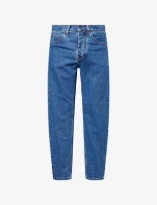 Carhartt WIP denim jeans100% cottonExposed button and concealed button-fly fastenings at frontRelaxed fit, tapered leg, mid-rise, belt loops, five pockets, brand patch at backMachine wash coldMade in TunisiaSize UK 30: rise 11in / 28cm, inside leg 28.5in / 72.5cm, leg opening 14in / 36cmModel is 6ft 2in/1.88m and wears a size UK 30Midweight, non-stretch