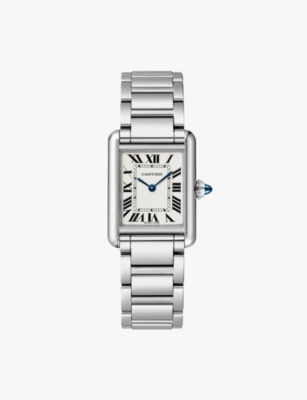 Cartier small stainless-steel quartz watch100% stainless steelStyle number: WSTA0051Steel folding-buckle fasteningRectangle case, two-hand quartz movement, sapphire-crystal glass, Roman numerals, cabochon crownCase diameter: 29.5mmCase thickness: 6.6mmWipe with a clean, dry clothWater resistance: 3 bar / 3 atm / 30m / 100ftMade in SwitzerlandTwo-year warranty + six additional years through Cartier Care registrationCartier prides itself on providing excellent customer service. This includes contacting customers to offer after sales care and share details about its brand and products. As such, when you order a Cartier product from us, your details will be passed onto Cartier so that it can provide these services to you.