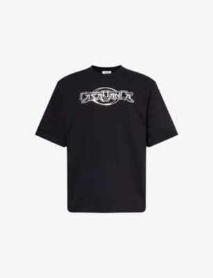 Casablanca cotton T-shirt100% cottonRegular fit, crewneck, short sleeves, metallic logo at frontHand washMade in PortugalModel is 6ft 2in/1.88m and wears a size mediumLightweight, slight stretch