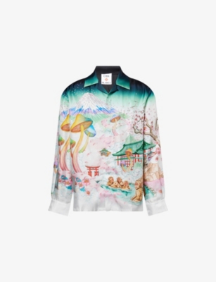 Casablanca silk shirt100% silkConcealed button fastenings at frontRelaxed fit, ribbed crewneck dropped shoulders, short sleeves, brand print at front and back, brand tab at backDry cleanSize large: length 28in / 71cm, chest 48in / 122cmModel is 6ft 2in/1.88m and wears a size largeLightweight, slight stretch