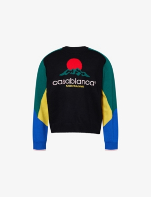 Casablanca wool-knit jumper100% woolRelaxed fit, crewneck, contrasting long sleeves, embroidered logo at front, ribbed trimsHand washModel is 6ft 2in/1.88m and wears a size mediumMidweight, slight stretch