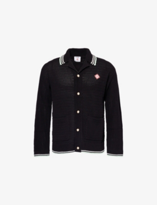 Casablanca cotton-crochet shirt100% cottonButton fastening at front Regular fit, camp collar, long sleeves, embroidered logo at chest and back, patch pockets at front, striped trimsHand washModel is 6ft 2in/1.88m and wears a size mediumMidweight, slight stretch