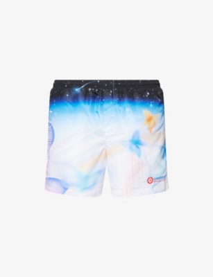 Casablanca swim shorts100% polyester; lining 80% polyester, 20% elastaneRelaxed fit, mid-rise, elasticated drawstring waistband, two side slip pockets, logo print at front, all-over seasonal airbrush artwork print, interior mesh shortsMachine wash at 30°CMade in PortugalModel is 6ft 2in/1.88m and wears a size mediumLightweight, non-stretch