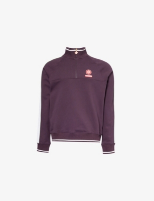 Casablanca cotton sweatshirt100% cottonExposed zip fastening at frontRegular fit, funnel neck, long sleeves, contrasting applique at sleeve, logo patch at chest and nape, striped ribbed trimsMachine wash at 30°CMade in PortugalModel is 6ft 2in/1.88m and wears a size mediumMidweight, slight stretch