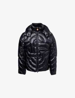 Casablanca shell-down jacket100% polyamide; filling 90% down, 10% feathers; lining 100% polyamideConcealed zip fastening at frontRegular fit, high-neck, detachable hood, long sleeves, elasticated cuffs, quilted monogram at front and back, all-over quilted and padded, fully lined, drawstring hemHand wash coldSize medium: length 25in / 64cm, chest 40in / 102cmModel is 6ft 2in/1.88m and wears a size mediumMidweight, non-stretch