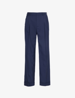 Casablanca wool trousers100% virgin wool; lining 52% viscose, 48% cottonConcealed button, hook-and-eye and zip-fly fastening at frontRegular fit, mid-rise, straight leg, belt loops, pleats at front, two slip pockets at front, two jetted pockets at back, folded cuffsSpecialist dry cleanMade in PortugalSize UK 32: rise 13in / 33.5cm, inside leg 33in / 84.5cm, leg opening 20in / 51.5cmModel is 6ft 2in/1.88m and wears a size UK 32Midweight, non-stretch