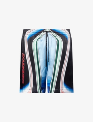 Casablanca silk shorts100% silkRelaxed fit, drawstring elasticated waistband, logo pattern at front, side slip pockets, patch pocket at back, all-over graphic patternDry cleanMade in ItalyModel is 6ft 2in/1.88m and wears a size mediumLightweight, non-stretch