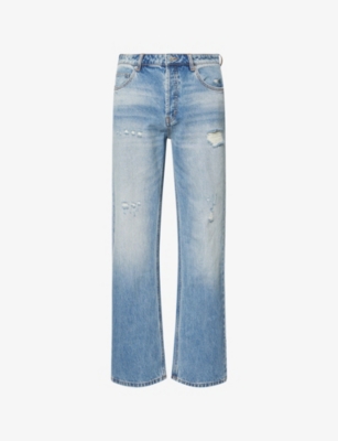Cole Buxton denim jeans100% cottonExposed button and button-fly fastening at frontRelaxed fit, straight leg, belt loops, five pockets, subtle hand distressed details all over, bison leather back patch with silver foiling,Machine wash coldSize UK 30: rise 11in / 29cm, inside leg 32in / 81.2cm, leg opening 18in / 46cmModel is 6ft 2in/1.88m and wears a size UK 30Midweight, non-stretch