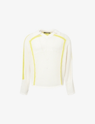 Daily Paper knitted top100% cottonclassic collar, V-neck, long sleeves, knitted text at front, striped pattern, open knit designMachine wash at 30°CModel is 6ft 2in/1.88m and wears a size mediumLightweight, non-stretch