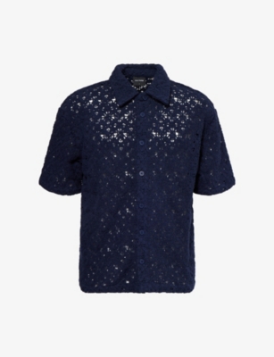 Daily Paper knitted shirt60% polyester, 40% cottonExposed button fastening at frontRelaxed fit, point collar, short sleeves, all-over open lace knit, straight hemMachine wash at 30°CSize medium: length 27.5in / 70cmModel is 6ft 2in/1.88m and wears a size mediumMidweight, non-stretch