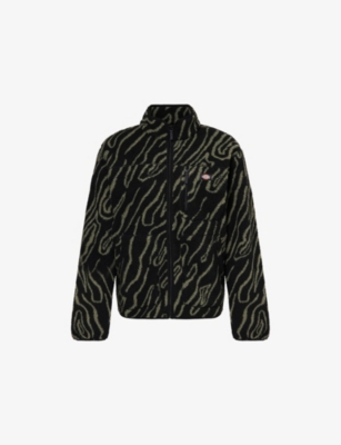 Dickies fleece jacket100% polyesterZip fasteningRelaxed fit, high neck, long sleeves, front patch pockets, bound seams, printed fleeceMachine wash mildSize medium: length 28.5in / 71.12cm, chest 46in / 116.8cmModel is 6ft 2in/1.88m and wears a size mediumMidweight, non-stretch