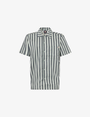 Dickies woven shirt62% lyocell, 38% cottonExposed button fastening at frontSpread collarClosed cuffsRelaxed fit, collar, short sleeves, patch pocket and brand patch at front, split at sides, all-over striped printMachine wash at 30°CSize medium: length 29in / 74cm, chest 46in / 117cmModel is 6ft 2in/1.88m and wears a size mediumLightweight, stretchy
