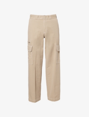 Dickies cotton cargo trousers100% cottonButton and zip-fly fasteningRelaxed fit, belt loops, side pockets, patch pockets on leg, contrast top stitchingMachine wash mildModel is 6ft 2in/1.88m and wears a size mediumMidweight, non-stretch