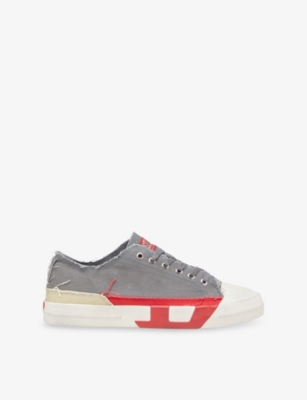 Diesel canvas trainers100% cottonLace-up fasteningRound closed toe, lace-up design, branding at the tongue, and mid-sole, raw edges, low topWipe with a clean, dry clothUpper: 100% cottonLining: 100% cottonSole: 100% rubber