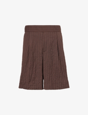 Dries Van Noten woven shorts100% polyesterPulls onRelaxed fit, elasticated waist, side pockets, all-over crinkled textureDry cleanSize medium: rise 17in / 43cm , leg length 10in / 25cm, leg opening 15in / 38cmModel is 6ft 2in/1.88m and wears a size mediumMidweight, slight stretch