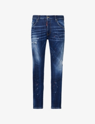 Dsquared2 denim jeans100% cottonButton and zip-fly fasteningMid rise, slim fit, five pockets, brand patch at back, belt loops, paint marks and detailing, mid washMachine wash at 30°CModel is 6ft 2in/1.88m and wears a size UK 32Midweight, slight stretch