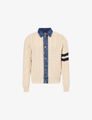 Dsquared2 cotton-blend cardigan76% cotton, 24% polyamideExposed button fastenings at frontRegular fit, spread collar, long sleeves, contrast panels, cable-knit, brand tab at frontMachine wash at 30°CModel is 6ft 2in/1.88m and wears a size mediumMidweight, slight stretch