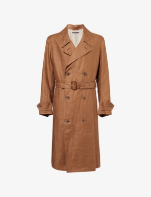 Dunhill linen trench coat100% linen; lining 100% woolButton fasteningRegular fit, double breasted, long sleeves, button tab cuffs, single vent at back, belted, lined in check wool, storm flap at back Dry cleanMade in ItalySize 40R UK: length 47in/ 119.3CM, chest 46in / 116cmModel is 6ft 2in/1.88m and wears a size UK 40RMidweight, non-stretch