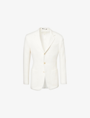 dunhill cotton blazer100% cottonExposed button fastenings at frontRegular fit, notched lapels, long sleeves, buttoned cuffs, welt pocket at chest, darts at front, two patch pockets at front, single vent at backSpecialist dry cleanSize UK 40: length 29in / 74cm, chest 40in / 102cmModel is 6ft 2in/1.88m and wears a size UK 40Midweight, non-stretch