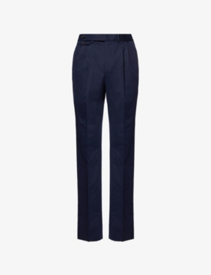 Dunhill cotton-blend trousers92% cotton, 7% cashmere, 1% elastaneConcealed button and zip-fly fastening at frontRegular fit, mid-rise, straight leg, belt loops, pleats at front, two slip pockets at front, two buttoned jetted pockets at back, unhemmedSpecialist dry cleanSize UK 40: rise 13in / 33.5cm, inside leg 35in / 89.5cm, leg opening 16in / 41cmModel is 6ft 2in/1.88m and wears a size UK 40Midweight, non-stretch