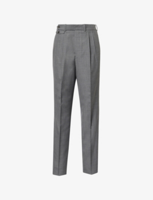 dunhill wool-blend trousers99% wool, 1% cashmere; lining 100% viscoseExposed button and concealed zip-fly fastening at frontRegular fit, mid-rise, straight leg, belt loops, partially elasticated at waist, pleats at front, two slip pockets at front, two buttoned jetted pockets at back, pressed centre creases, unhemmedSpecialist dry cleanSize UK 40: rise 13in / 33.5cm, inside leg 35in / 89.5cm, leg opening 16in / 41cmModel is 6ft 2in/1.88m and wears a size UK 40Midweight, non-stretch