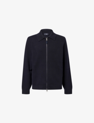 Dunhill cotton and cashmere-blend jacket53% cotton, 47% cashmereConcealed two-way zip fastening at front Regular fit, collar, long sleeves, exposed seams, two side zip pockets, ribbed trims, silver-toned hardware, knittedDry cleanMade in ItalyModel is 6ft 2in/1.88m and wears a size mediumMidweight, slight stretch