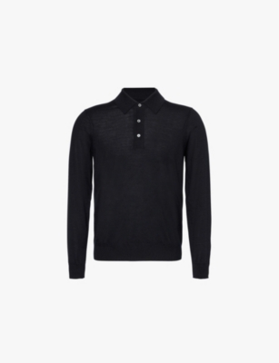 Dunhill cashmere-knit polo100% cashmereExposed button fastening at frontRelaxed fit, polo collar, long sleeves, branded pearlescent buttons, fine knit, ribbed trimsDry clean onlyMade in ItalyModel is 6ft 2in/1.88m and wears a size mediumLightweight, slight stretch