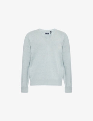 Dunhill cashmere-blend jumper59% cashmere, 41% linenRegular fit, V-neck, long sleeves, logo embroidery at chest, ribbed trimsDry clean onlyMade in ItalyModel is 6ft 3in/1.91m and wears a size mediumMidweight, slight stretch
