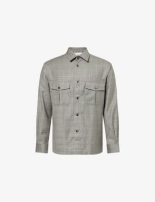 Dunhill merino-wool overshirt100% merino woolExposed button fastenings at frontStraight-point collarRegular fit, collar, suede undercollar, long sleeves, buttoned cuffs, two chest flap buttoned pockets, split back yoke, knife pleats, side vents, all-over windowpane check patternMachine wash at 40°CModel is 6ft 2in/1.88m and wears a size mediumLightweight, non-stretch