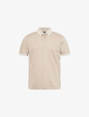 Emporio Armani cotton polo shirt100% cotton; trims 95% cotton, 5% elastaneExposed button fastenings at frontPolo collarRegular fit, collar, button placket, dropped shoulders, eagle logo embroidered at collar, contrasting stripe trims, short side slitsMachine wash at 30°CMade in TurkeyModel is 6ft 2in/1.88m and wears a size mediumLightweight, slight stretch