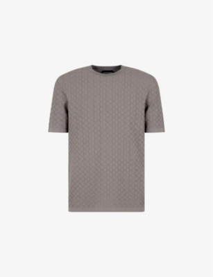 Emporio Armani knitted jumper85% viscose, 15% polyesterPulls onRegular fit, crewneck, short sleeves, embossed knit pattern, ribbed trimsHand washModel is 6ft 2in/1.88m and wears a size mediumLightweight, stretchy