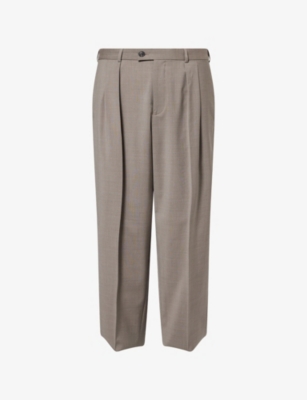 Emporio Armani wool trousers100% woolButton fasteningStraight leg, flat front, part elasticated waist, side pockets, back welt pockets, pressed front creases Unfinished hems- ready for tailoringDry cleanSize UK 32: rise 13in / 33cm, leg length 34in / 86.3cm, leg opening 20in / 50.8cmModel is 6ft 2in/1.88m and wears a size UK 32Midweight, non-stretch