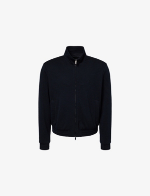 Emporio Armani wool-blend jacket28% viscose, 28% wool, 27% acrylic, 14% polyamide, 3% elastane; lining 68% acetate, 32% polyesterConcealed two-way zip fastening at frontRelaxed fit, high neck, long sleeves, two side slip pockets, ribbed trims, chevron jacquard pattern, fully linedDry cleanSize medium: length 26in / 66cm, chest 39in / 99cmModel is 6ft 2in/1.88m and wears a size mediumMidweight, slight stretch