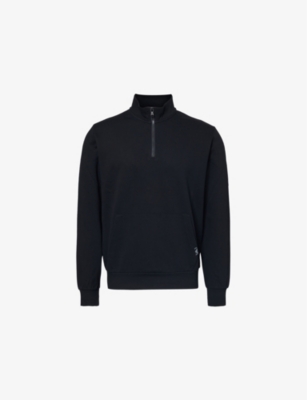 Emporio Armani stretch-woven sweatshirt54% polyester, 39% cotton, 7% elastaneExposed zip fastening at frontRegular fit, high neck, long sleeves, kangaroo pocket at front, brand tab at frontMachine wash at 30°CModel is 6ft 2in/1.88m and wears a size mediumMidweight, non-stretch