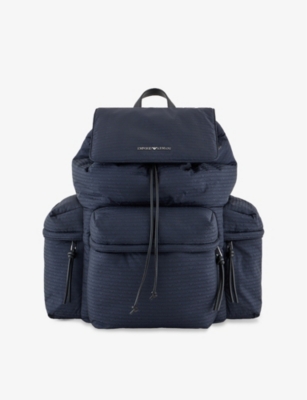 Emporio Armani shell backpack100% polyamideDrawstring fasteningTop carry handle, adjustable shoulder straps, padded mesh back, all-over jacquard logo, brand plaque at front, flap closure, one main compartment, exterior zipped pocket, two zipped pockets at sideHeight 48cm, width 31cm, depth 18.5cmWipe with a clean, dry cloth