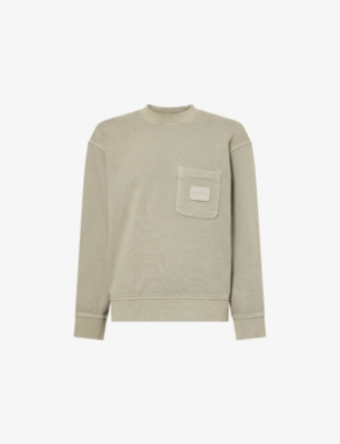 Emporio Armani cotton-jersey sweatshirt100% cotton; trims 96% cotton, 4% elastaneRelaxed fit, crewneck, dropped shoulders, long sleeves, one chest patch pocket, branded leather patch at chest, ribbed trimsHand washModel is 6ft 2in/1.88m and wears a size mediumMidweight, slight stretch