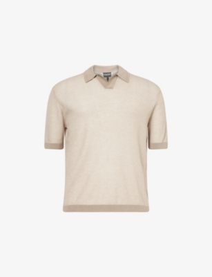 Emporio Armani knitted polo shirt55% lyocell, 40% wool, 5% silkPulls onRegular fit, collared, short sleeves, V-neck, Eagle logo embroidery at hem, ribbed trimsHand wash coldModel is 6ft 2in/1.88m and wears a size mediumLightweight, slight stretch
