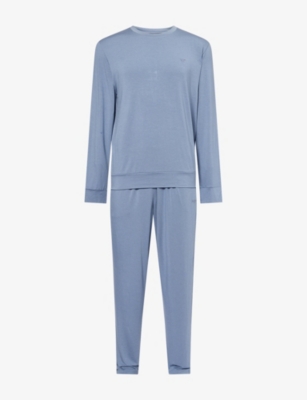 Emporio Armani stretch-jersey pyjamas76% lyocell, 19% wool, 5% elastaneTop: regular fit, crewneck, long sleeves, logo embroidery, flat trimsBottoms: elasticated waistband, side pockets, logo embroidery, flat cuffsMachine wash coldLightweight, slight stretch