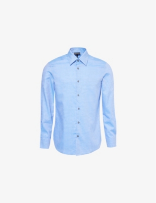 Emporio Armani cotton shirt100% cottonButton fasteningRegular fit, classic collar, long sleeves, single button cuffs, all-over logo text print, straight hemMachine wash mildModel is 6ft 2in/1.88m and wears a size mediumLightweight, non-stretch