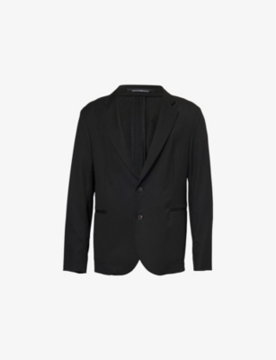 Emporio Armani woven blazer68% polyester, 29% viscose, 3% elastane; sleevelining 68% acetate, 32% polyesterExposed button fastenings at frontRegular fit, single-breasted, notch lapels, long sleeves, two front welt pockets, linedDry cleanMade in RomaniaSize UK 50: length 31in / 78.5cm, chest 39in / 99cmModel is 6ft 2in/1.88m and wears a size UK 40Midweight, non-stretch