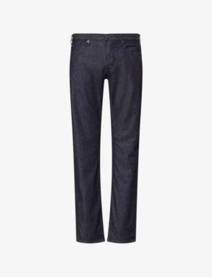 Emporio Armani denim jeans99% cotton, 1% elastaneButton and zip-fly fastenings at frontSlim fit, low-rise, tapered leg, belt loops, five pocketsMachine wash at 30°CSize UK 32: rise 9.5in / 24cm, inside leg 33.5in / 85cm, leg opening 15in / 38cmModel is 6ft 2in/1.88m and wears a size UK 32Midweight, slight stretch